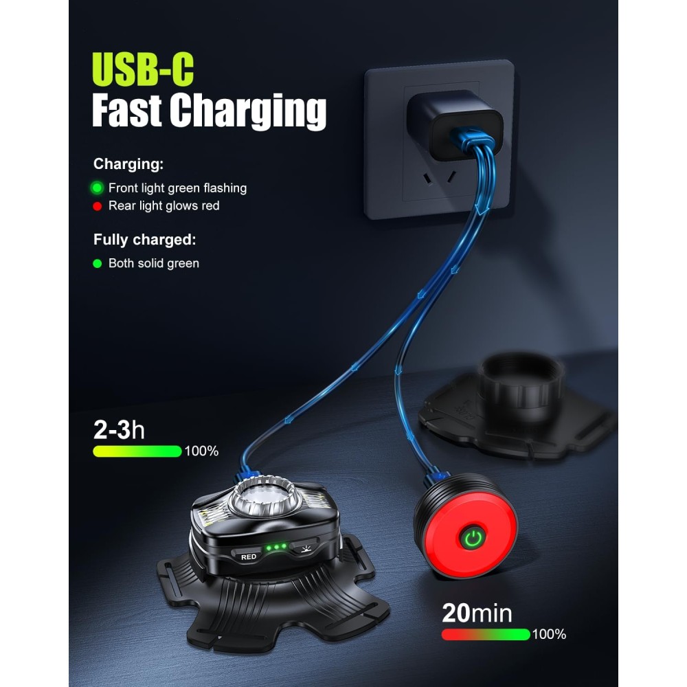 - [6+2 Versatile Lighting Modes] Tailor your visibility to any condition. Choose from 6 front light modes (White Constant/ Spotlight/ Side Light | Red Constant/ Flashing/ SOS) and 2 rear light modes (Red Constant/ Flashing) for maximum safety in changing conditions. The front light’s convenient memory function remembers your last-used setting—simply long-press to power off the running light, and it automatically resumes your preferred mode next time. No more cycling through options every use.