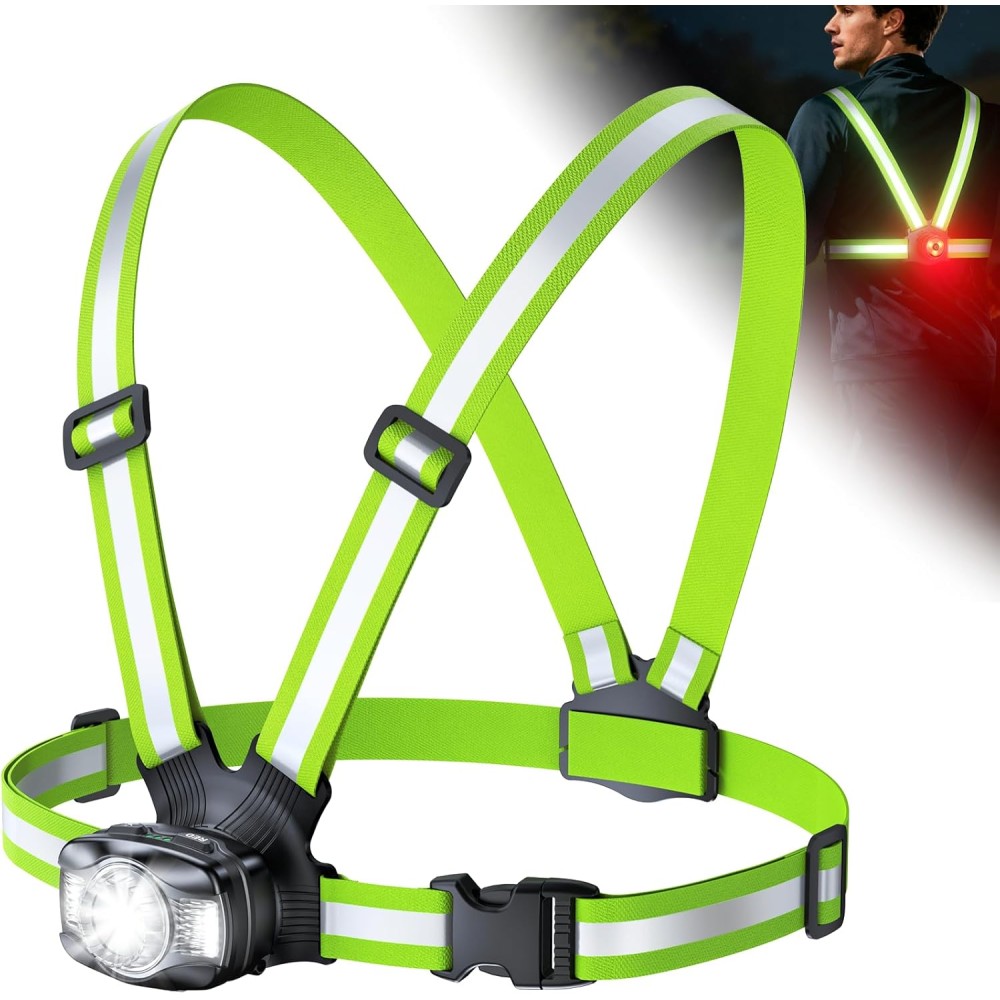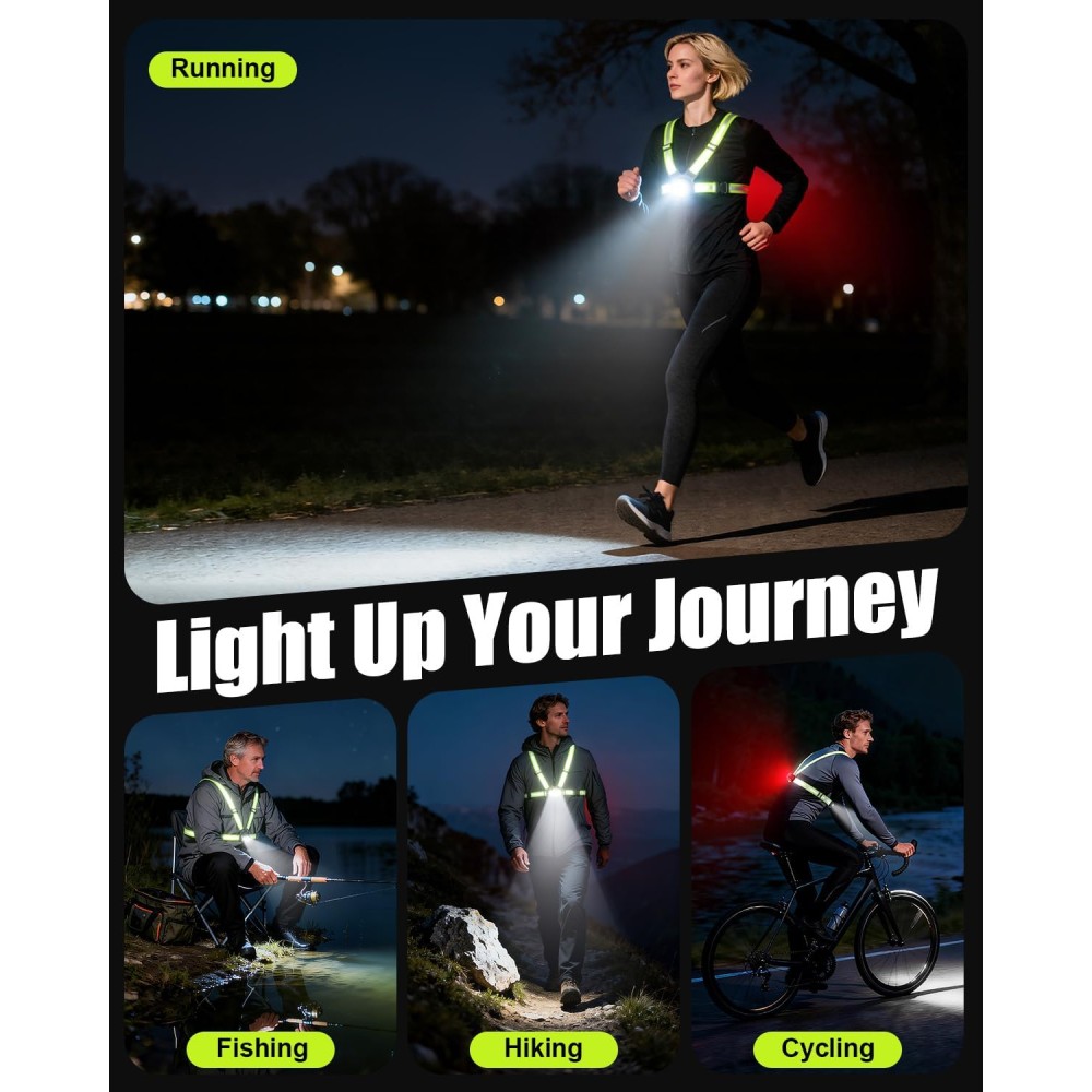 - [Adjustable Fit & 45° Tilt Beam] Designed with dual straps, adjustable buckles, and elastic bands, our reflective running gear fits all body types by adjusting shoulder length and waist size. The straps distribute weight evenly, avoiding the tightness of traditional headlamps. Plus, the front light 45° tiltable beam allows precise light positioning, focusing on distant paths or close details without neck strain, perfect for long-distance activities.
